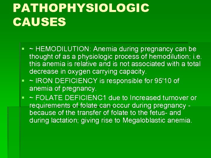PATHOPHYSIOLOGIC CAUSES § ~ HEMODILUTION: Anemia during pregnancy can be thought of as a physiologic process of hemodilution; i. e. this anemia is relative and is not associated with a total decrease in oxygen carrying capacity. § ~ IRON DEFICIENCY is responsible for 95'10 of anemia of pregnancy. § ~ FOLATE DEFICIENC 1 due to Increased turnover or requirements of folate can occur during pregnancy - because of the transfer of folate to the fetus- and during lactation; giving rise to Megaloblastic anemia.