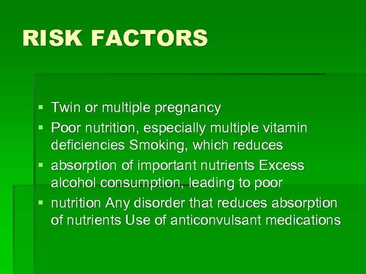 RISK FACTORS § Twin or multiple pregnancy § Poor nutrition, especially multiple vitamin deficiencies Smoking, which reduces § absorption of important nutrients Excess alcohol consumption, leading to poor § nutrition Any disorder that reduces absorption of nutrients Use of anticonvulsant medications
