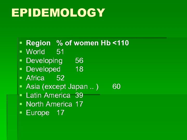 EPIDEMOLOGY § § § § § Region % of women Hb <110 World 51 Developing 56 Developed 18 Africa 52 Asia (except Japan. . ) 60 Latin America 39 North America 17 Europe 17