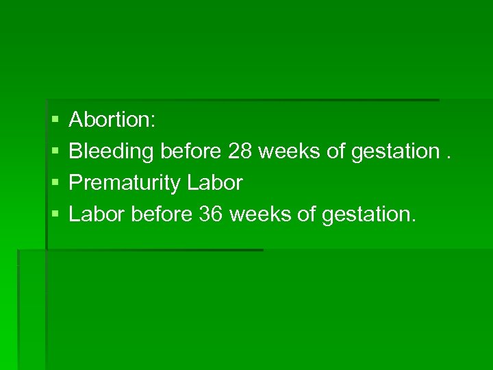 § § Abortion: Bleeding before 28 weeks of gestation. Prematurity Labor before 36 weeks of gestation.