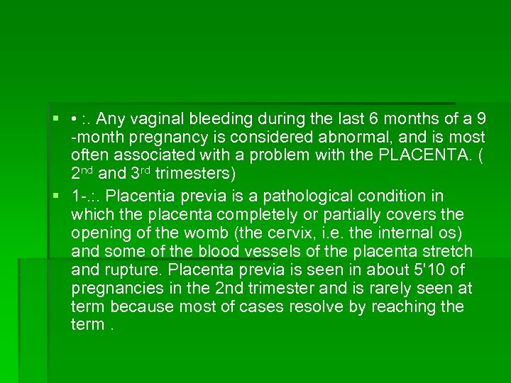§ • : . Any vaginal bleeding during the last 6 months of a 9 -month pregnancy is considered abnormal, and is most often associated with a problem with the PLACENTA. ( 2 nd and 3 rd trimesters) § 1 -. : . Placentia previa is a pathological condition in which the placenta completely or partially covers the opening of the womb (the cervix, i. e. the internal os) and some of the blood vessels of the placenta stretch and rupture. Placenta previa is seen in about 5'10 of pregnancies in the 2 nd trimester and is rarely seen at term because most of cases resolve by reaching the term.