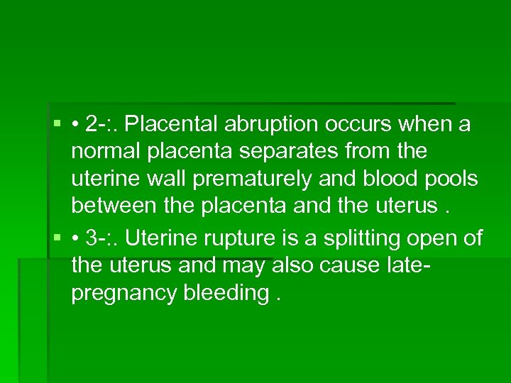 § • 2 -: . Placental abruption occurs when a normal placenta separates from the uterine wall prematurely and blood pools between the placenta and the uterus. § • 3 -: . Uterine rupture is a splitting open of the uterus and may also cause latepregnancy bleeding.