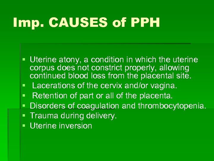 Imp. CAUSES of PPH § Uterine atony, a condition in which the uterine corpus does not constrict properly, allowing continued blood loss from the placental site. § Lacerations of the cervix and/or vagina. § Retention of part or all of the placenta. § Disorders of coagulation and thrombocytopenia. § Trauma during delivery. § Uterine inversion
