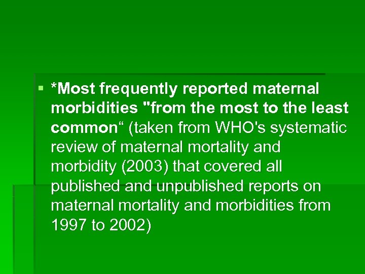 § *Most frequently reported maternal morbidities "from the most to the least common“ (taken from WHO's systematic review of maternal mortality and morbidity (2003) that covered all published and unpublished reports on maternal mortality and morbidities from 1997 to 2002)