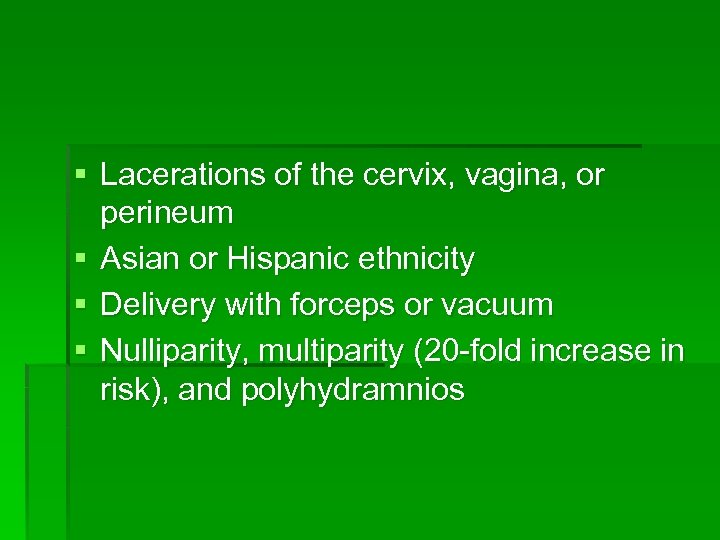 § Lacerations of the cervix, vagina, or perineum § Asian or Hispanic ethnicity § Delivery with forceps or vacuum § Nulliparity, multiparity (20 -fold increase in risk), and polyhydramnios