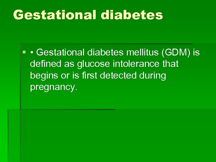 Gestational diabetes § • Gestational diabetes mellitus (GDM) is defined as glucose intolerance that begins or is first detected during pregnancy.