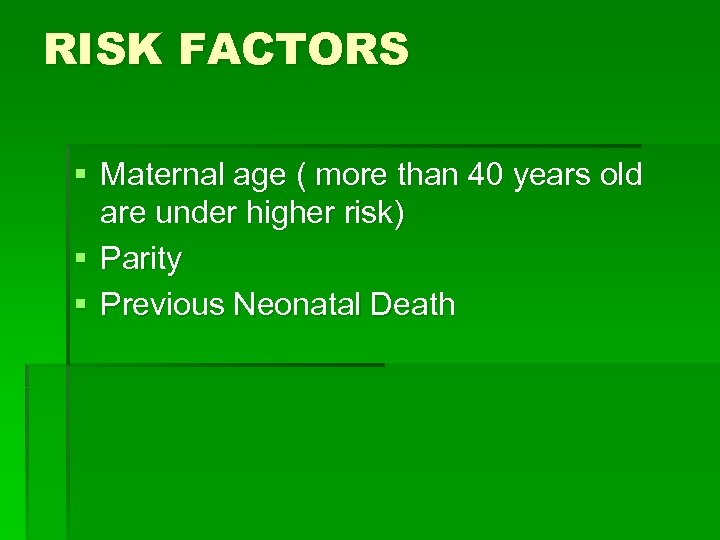 RISK FACTORS § Maternal age ( more than 40 years old are under higher risk) § Parity § Previous Neonatal Death