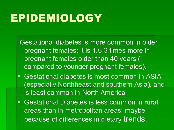 EPIDEMIOLOGY Gestational diabetes is more common in older pregnant females; it is 1. 5 -3 times more in pregnant females older than 40 years ( compared to younger pregnant females). § Gestational diabetes is most common in ASIA (especially Northheast and southern Asia), and is least common in North America. § Gestational Diabetes is less common in rural areas than in metropolitan areas; maybe because of differences in dietary trends.