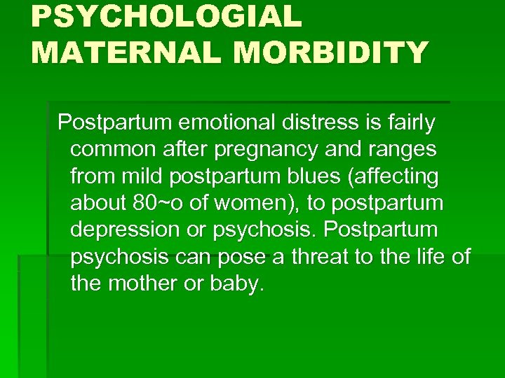 PSYCHOLOGIAL MATERNAL MORBIDITY Postpartum emotional distress is fairly common after pregnancy and ranges from mild postpartum blues (affecting about 80~o of women), to postpartum depression or psychosis. Postpartum psychosis can pose a threat to the life of the mother or baby.