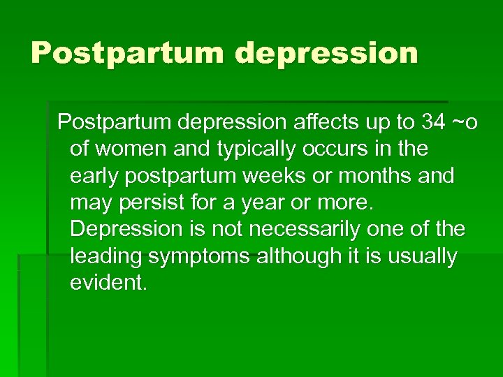 Postpartum depression affects up to 34 ~o of women and typically occurs in the early postpartum weeks or months and may persist for a year or more. Depression is not necessarily one of the leading symptoms although it is usually evident.