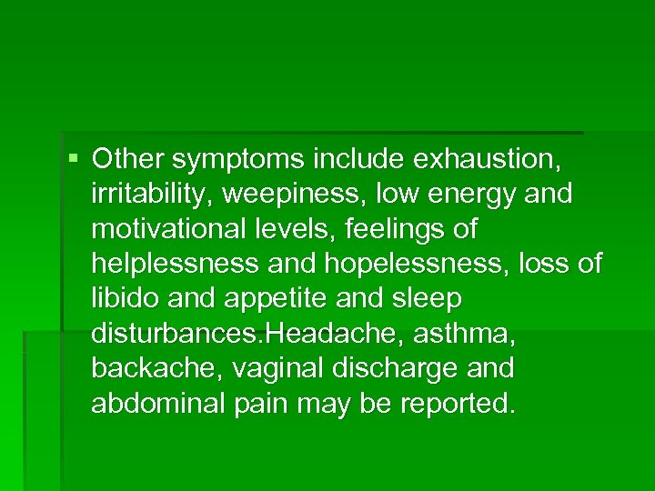 § Other symptoms include exhaustion, irritability, weepiness, low energy and motivational levels, feelings of helplessness and hopelessness, loss of libido and appetite and sleep disturbances. Headache, asthma, backache, vaginal discharge and abdominal pain may be reported.