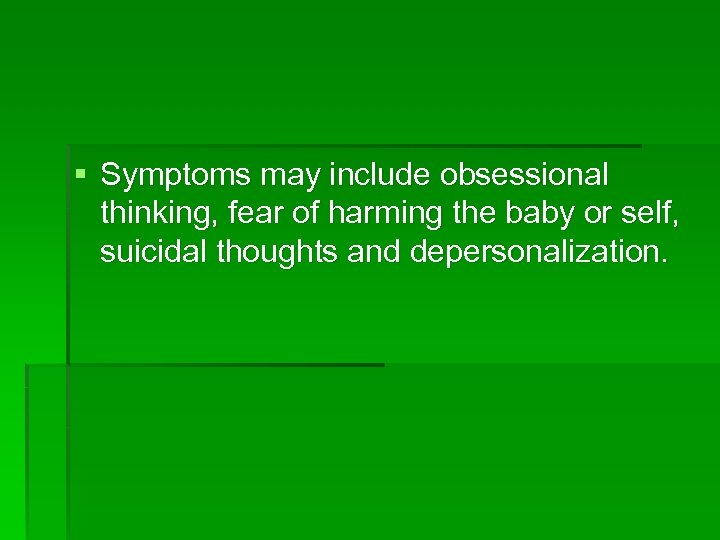 § Symptoms may include obsessional thinking, fear of harming the baby or self, suicidal thoughts and depersonalization.