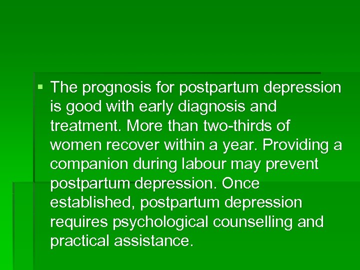 § The prognosis for postpartum depression is good with early diagnosis and treatment. More than two-thirds of women recover within a year. Providing a companion during labour may prevent postpartum depression. Once established, postpartum depression requires psychological counselling and practical assistance.