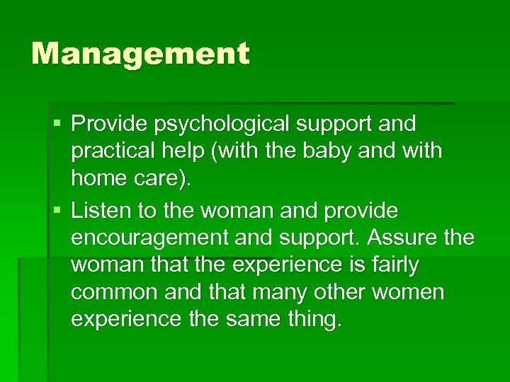 Management § Provide psychological support and practical help (with the baby and with home care). § Listen to the woman and provide encouragement and support. Assure the woman that the experience is fairly common and that many other women experience the same thing.
