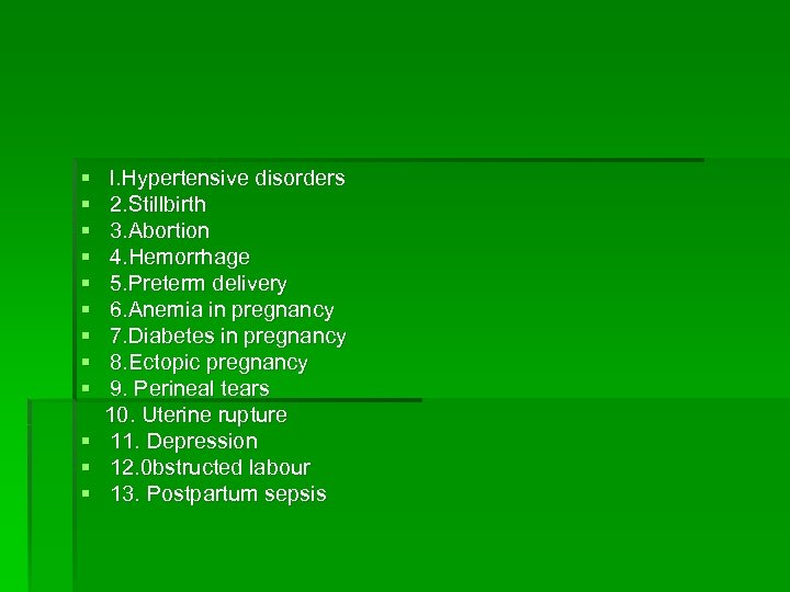 § l. Hypertensive disorders § 2. Stillbirth § 3. Abortion § 4. Hemorrhage § 5. Preterm delivery § 6. Anemia in pregnancy § 7. Diabetes in pregnancy § 8. Ectopic pregnancy § 9. Perineal tears 10. Uterine rupture § 11. Depression § 12. 0 bstructed labour § 13. Postpartum sepsis
