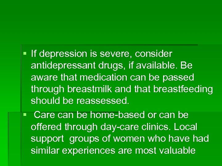 § If depression is severe, consider antidepressant drugs, if available. Be aware that medication can be passed through breastmilk and that breastfeeding should be reassessed. § Care can be home-based or can be offered through day-care clinics. Local support groups of women who have had similar experiences are most valuable