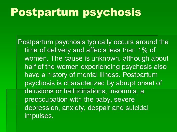 Postpartum psychosis typically occurs around the time of delivery and affects less than 1% of women. The cause is unknown, although about half of the women experiencing psychosis also have a history of mental illness. Postpartum psychosis is characterized by abrupt onset of delusions or hallucinations, insomnia, a preoccupation with the baby, severe depression, anxiety, despair and suicidal impulses.