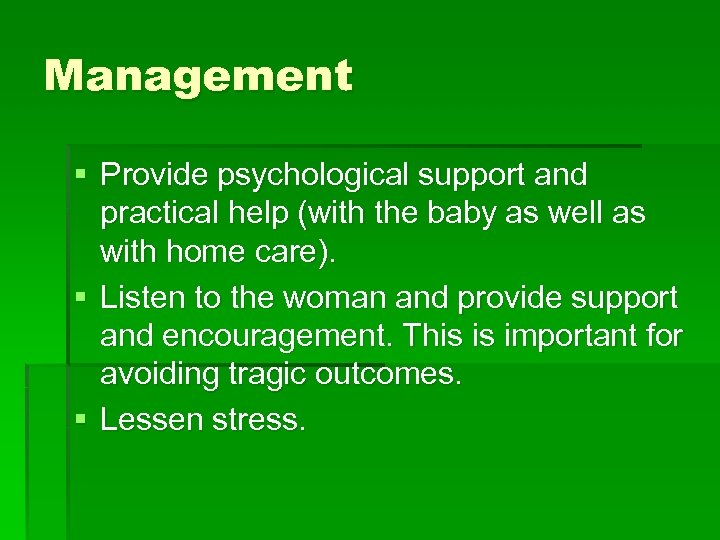 Management § Provide psychological support and practical help (with the baby as well as with home care). § Listen to the woman and provide support and encouragement. This is important for avoiding tragic outcomes. § Lessen stress.