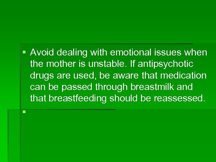 § Avoid dealing with emotional issues when the mother is unstable. If antipsychotic drugs are used, be aware that medication can be passed through breastmilk and that breastfeeding should be reassessed. §