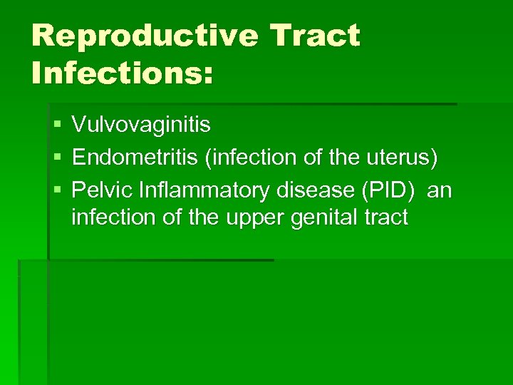 Reproductive Tract Infections: § § § Vulvovaginitis Endometritis (infection of the uterus) Pelvic Inflammatory disease (PID) an infection of the upper genital tract