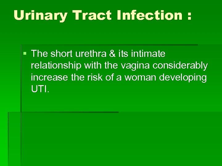 Urinary Tract Infection : § The short urethra & its intimate relationship with the vagina considerably increase the risk of a woman developing UTI.
