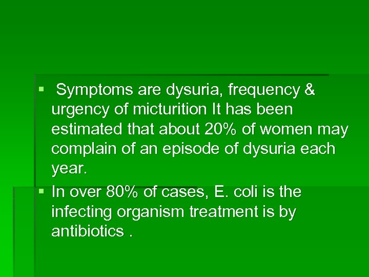 § Symptoms are dysuria, frequency & urgency of micturition It has been estimated that about 20% of women may complain of an episode of dysuria each year. § In over 80% of cases, E. coli is the infecting organism treatment is by antibiotics.