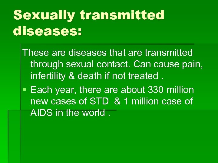 Sexually transmitted diseases: These are diseases that are transmitted through sexual contact. Can cause pain, infertility & death if not treated. § Each year, there about 330 million new cases of STD & 1 million case of AIDS in the world.