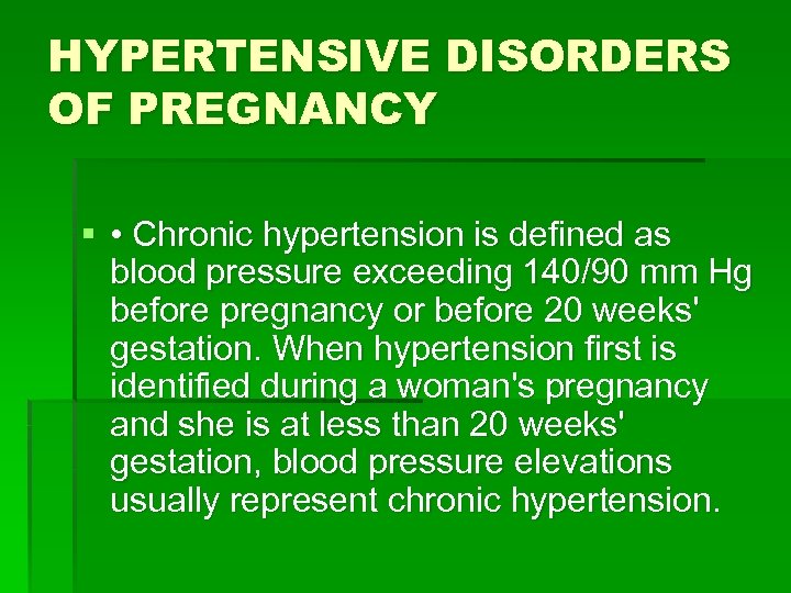 HYPERTENSIVE DISORDERS OF PREGNANCY § • Chronic hypertension is defined as blood pressure exceeding 140/90 mm Hg before pregnancy or before 20 weeks' gestation. When hypertension first is identified during a woman's pregnancy and she is at less than 20 weeks' gestation, blood pressure elevations usually represent chronic hypertension.