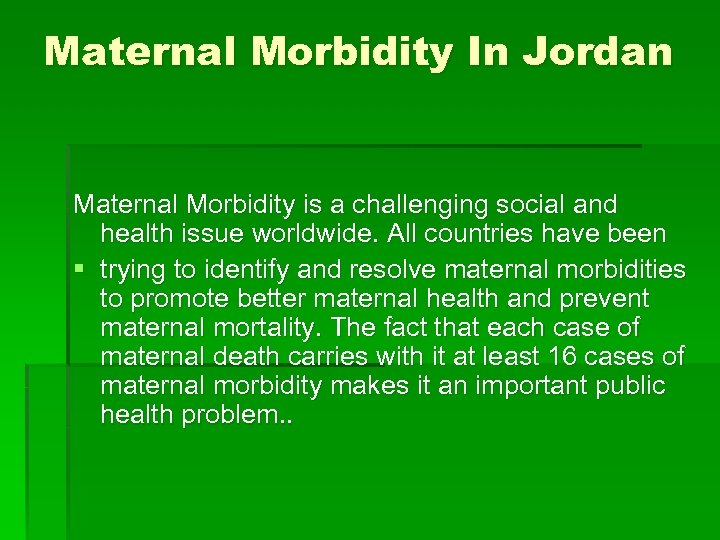 Maternal Morbidity In Jordan Maternal Morbidity is a challenging social and health issue worldwide. All countries have been § trying to identify and resolve maternal morbidities to promote better maternal health and prevent maternal mortality. The fact that each case of maternal death carries with it at least 16 cases of maternal morbidity makes it an important public health problem. .