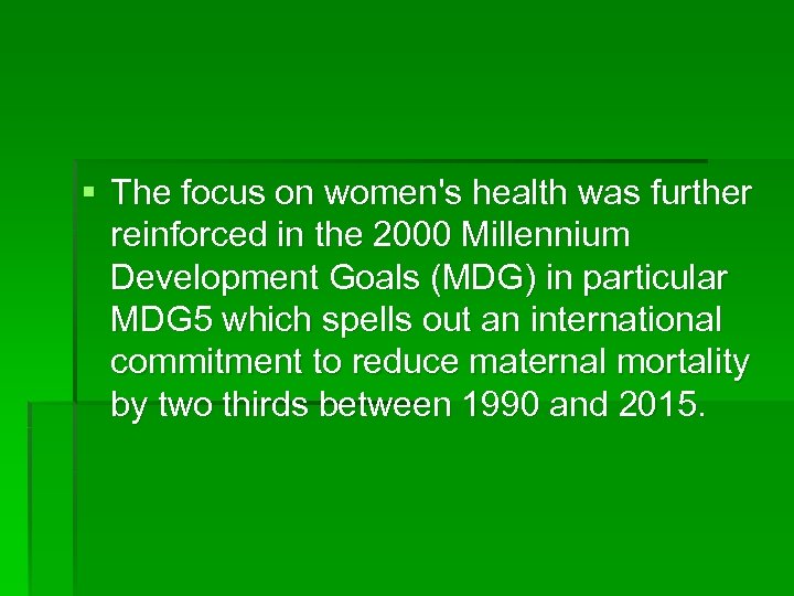 § The focus on women's health was further reinforced in the 2000 Millennium Development Goals (MDG) in particular MDG 5 which spells out an international commitment to reduce maternal mortality by two thirds between 1990 and 2015.