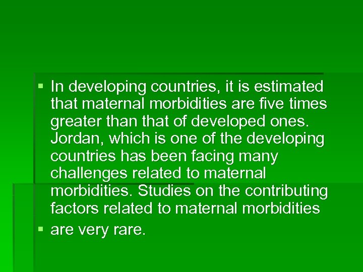 § In developing countries, it is estimated that maternal morbidities are five times greater than that of developed ones. Jordan, which is one of the developing countries has been facing many challenges related to maternal morbidities. Studies on the contributing factors related to maternal morbidities § are very rare