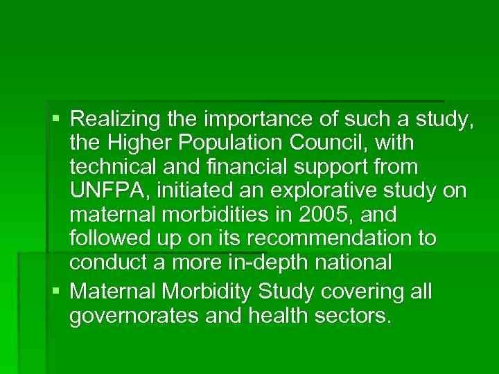 § Realizing the importance of such a study, the Higher Population Council, with technical and financial support from UNFPA, initiated an explorative study on maternal morbidities in 2005, and followed up on its recommendation to conduct a more in-depth national § Maternal Morbidity Study covering all governorates and health sectors.