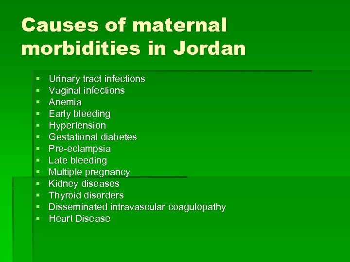 Causes of maternal morbidities in Jordan § § § § Urinary tract infections Vaginal infections Anemia Early bleeding Hypertension Gestational diabetes Pre-eclampsia Late bleeding Multiple pregnancy Kidney diseases Thyroid disorders Disseminated intravascular coagulopathy Heart Disease