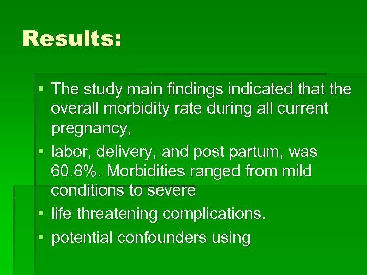 Results: § The study main findings indicated that the overall morbidity rate during all current pregnancy, § labor, delivery, and post partum, was 60. 8%. Morbidities ranged from mild conditions to severe § life threatening complications. § potential confounders using