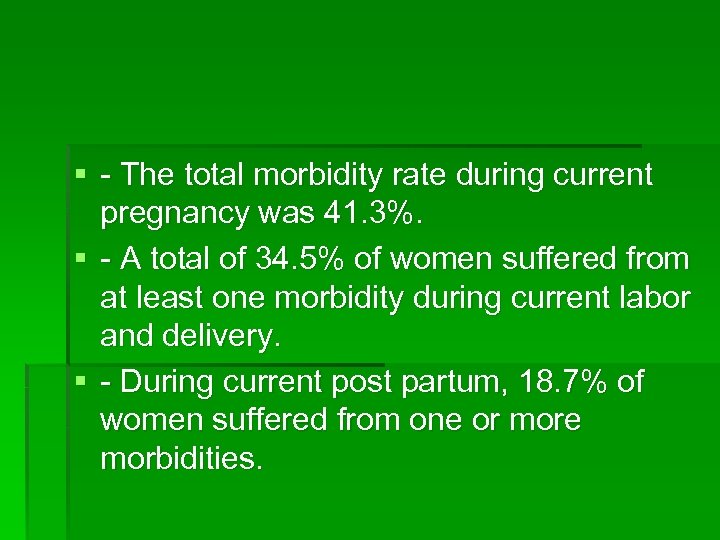 § - The total morbidity rate during current pregnancy was 41. 3%. § - A total of 34. 5% of women suffered from at least one morbidity during current labor and delivery. § - During current post partum, 18. 7% of women suffered from one or more morbidities.