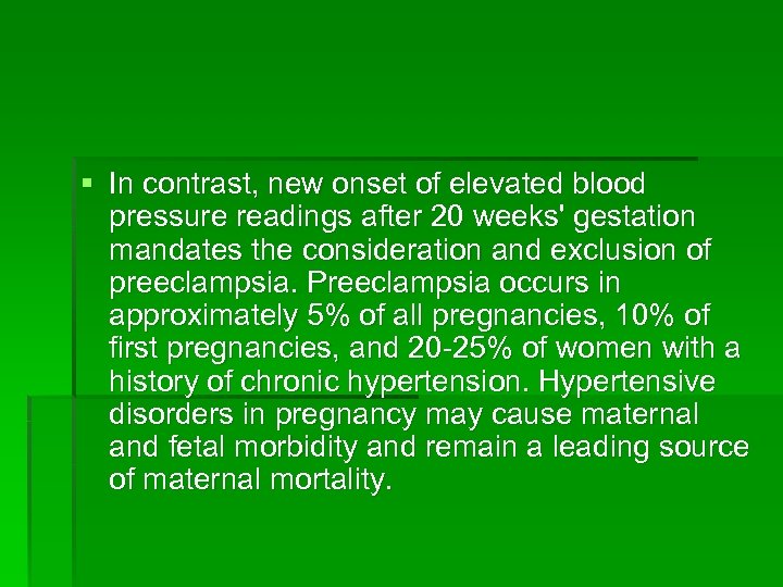 § In contrast, new onset of elevated blood pressure readings after 20 weeks' gestation mandates the consideration and exclusion of preeclampsia. Preeclampsia occurs in approximately 5% of all pregnancies, 10% of first pregnancies, and 20 -25% of women with a history of chronic hypertension. Hypertensive disorders in pregnancy may cause maternal and fetal morbidity and remain a leading source of maternal mortality.