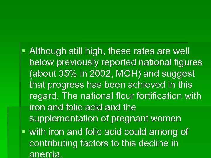 § Although still high, these rates are well below previously reported national figures (about 35% in 2002, MOH) and suggest that progress has been achieved in this regard. The national flour fortification with iron and folic acid and the supplementation of pregnant women § with iron and folic acid could among of contributing factors to this decline in anemia.