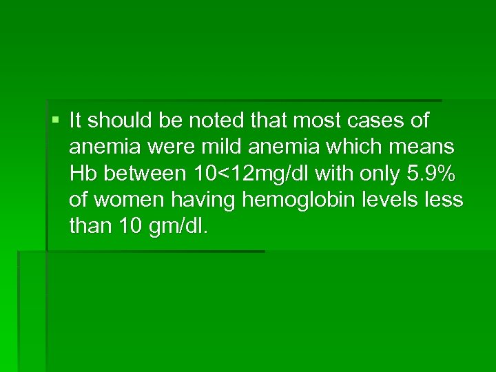 § It should be noted that most cases of anemia were mild anemia which means Hb between 10<12 mg/dl with only 5. 9% of women having hemoglobin levels less than 10 gm/dl.