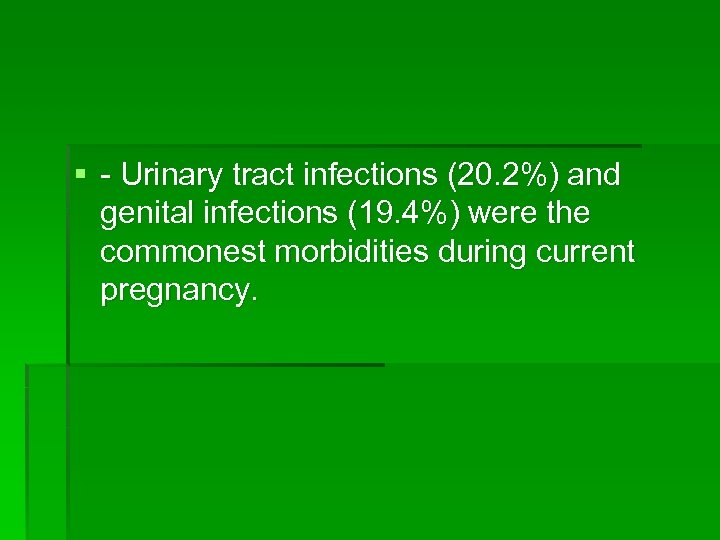 § - Urinary tract infections (20. 2%) and genital infections (19. 4%) were the commonest morbidities during current pregnancy.