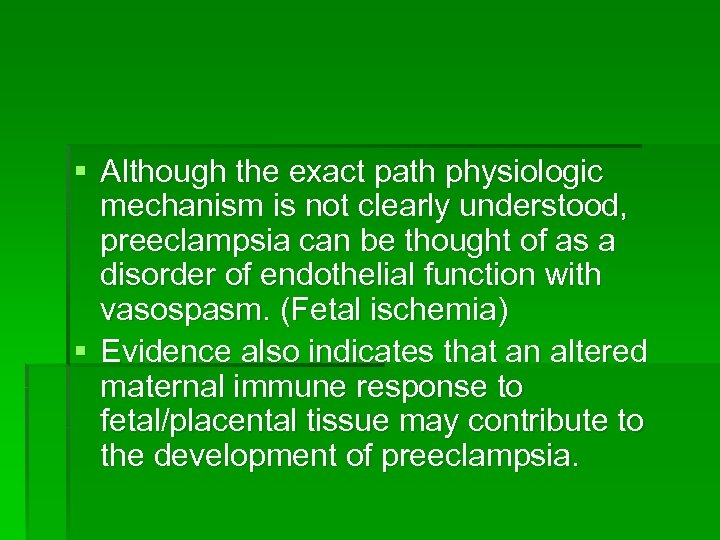 § Although the exact path physiologic mechanism is not clearly understood, preeclampsia can be thought of as a disorder of endothelial function with vasospasm. (Fetal ischemia) § Evidence also indicates that an altered maternal immune response to fetal/placental tissue may contribute to the development of preeclampsia.