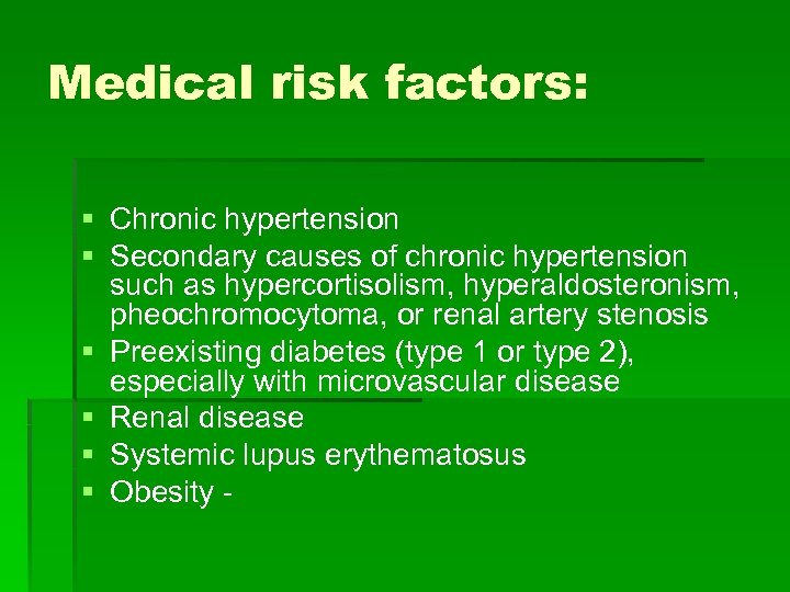 Medical risk factors: § Chronic hypertension § Secondary causes of chronic hypertension such as hypercortisolism, hyperaldosteronism, pheochromocytoma, or renal artery stenosis § Preexisting diabetes (type 1 or type 2), especially with microvascular disease § Renal disease § Systemic lupus erythematosus § Obesity -