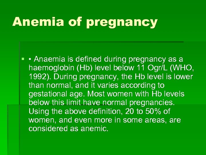 Anemia of pregnancy § • Anaemia is defined during pregnancy as a haemoglobin (Hb) level below 11 Ogr/L (WHO, 1992). During pregnancy, the Hb level is lower than normal, and it varies according to gestational age. Most women with Hb levels below this limit have normal pregnancies. Using the above definition, 20 to 50% of women, and even more in some areas, are considered as anemic.