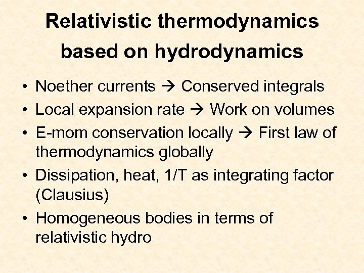Relativistic thermodynamics based on hydrodynamics • Noether currents Conserved integrals • Local expansion rate Work on volumes • E-mom conservation locally First law of thermodynamics globally • Dissipation, heat, 1/T as integrating factor (Clausius) • Homogeneous bodies in terms of relativistic hydro