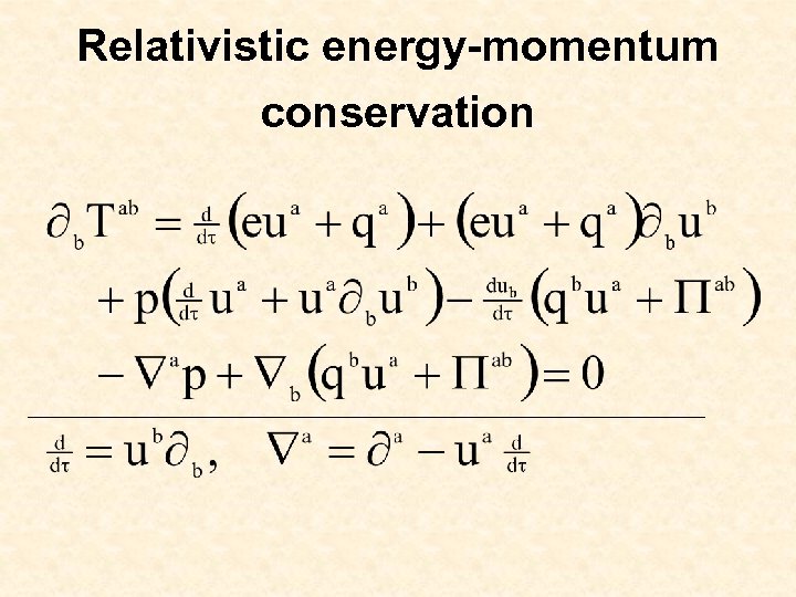Some Questions • What moves (flows)? – baryon, electric, etc. charge ( Eckart : v = 0) – energy-momentum ( Landau : w = 0) • What is a body? – extended volumes – local expansion factor (Hubble) • What is the covariant form eos? – functional form of S(E, V, N, …) • How does T transform?