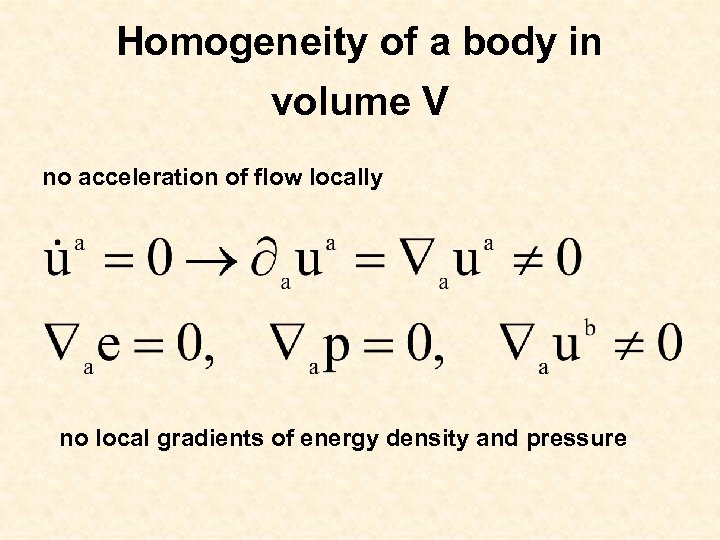 Homogeneity of a body in volume V no acceleration of flow locally no local gradients of energy density and pressure