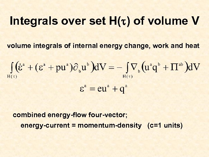 Integrals over set H( ) of volume V volume integrals of internal energy change, work and heat combined energy-flow four-vector; energy-current = momentum-density (c=1 units)