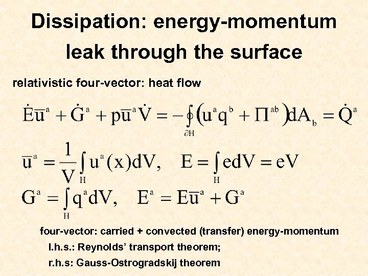 Dissipation: energy-momentum leak through the surface relativistic four-vector: heat flow four-vector: carried + convected (transfer) energy-momentum l. h. s. : Reynolds’ transport theorem; r. h. s: Gauss-Ostrogradskij theorem