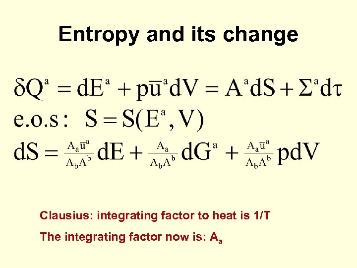 Entropy and its change Clausius: integrating factor to heat is 1/T The integrating factor now is: Aa