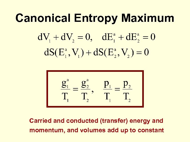 Canonical Entropy Maximum Carried and conducted (transfer) energy and momentum, and volumes add up to constant