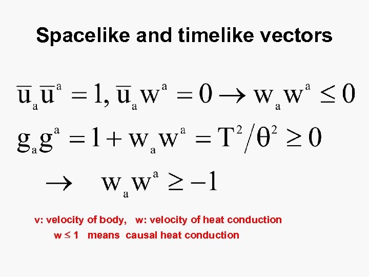 Spacelike and timelike vectors v: velocity of body, w: velocity of heat conduction w 1 means causal heat conduction